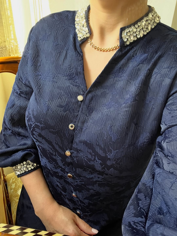 شومیز مجلسی با پارچه ژاکارد ابریشم ترک که قسمت یقه و لب آستین سنگ دوزی شده سایز بندی : ۴۰ تا ۴۸ رنگبندی: مشکی ، سفید ، سورمه ای