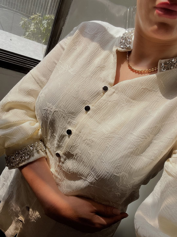 شومیز مجلسی با پارچه ژاکارد ابریشم ترک که قسمت یقه و لب آستین سنگ دوزی شده سایز بندی ۴۰ تا ۴۴ رنگبندی: مشکی ، سفید ، سورمه ای