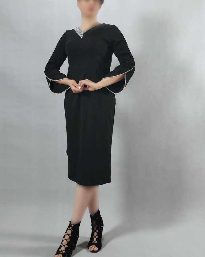 پیراهن مجلسی با پارچه کرپ کش (دالقیچ) از سایز ۴۰ تا ۴۶ با خرجکار نوار نگینی ترک تکرنگ مشکی