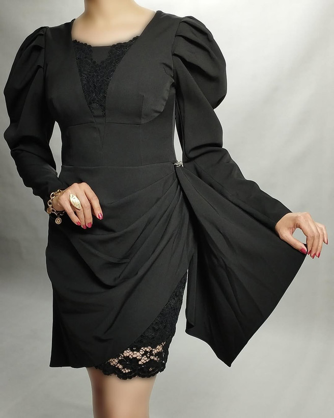 پیراهن دخترونه جذابمون شما رو خاص و متفاوت میکنه سایزش از ۳۸ تا ۴۲ داره رنگش فقط مشکی جنس پارچه کرپ و گیپور مخملی