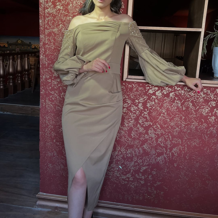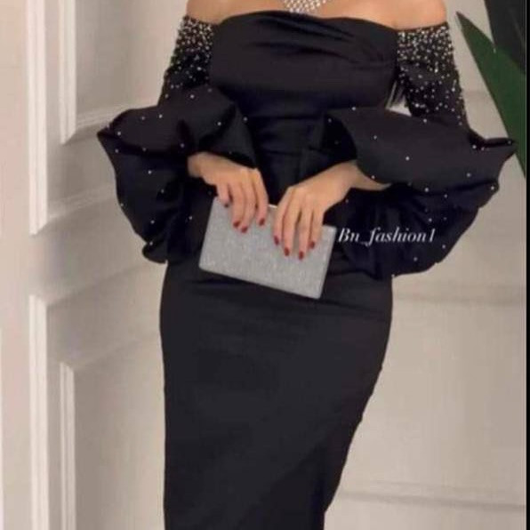 پیراهن مجلسی دکلته با آستین بلند پفی و دامن لنگی که قسمت یقه جواهردوزی شده در سه رنگ مشکی و کرم و سبز از سایز۳۸ تا ۴۶ با پارچه کرپ vip