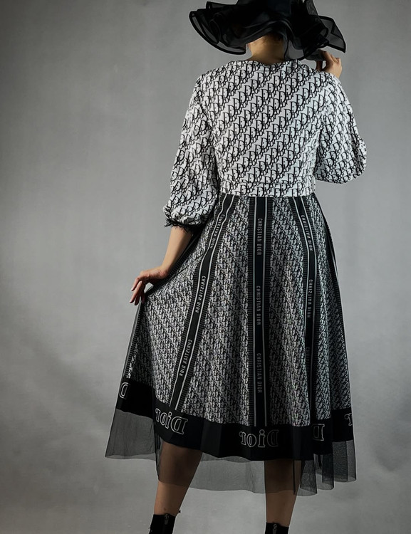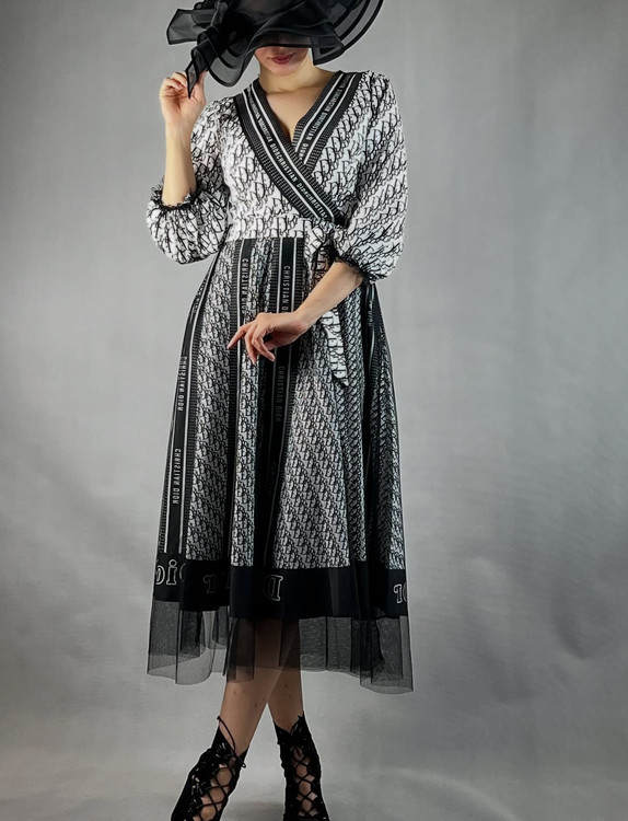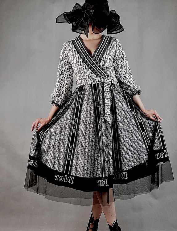 پیراهن پرطرفدار دیور از سایز ۳۸ تا ۴۸ روی دامن تور داره و مدل یقه چپ و راستی جنس پارچه کرپ الیزه